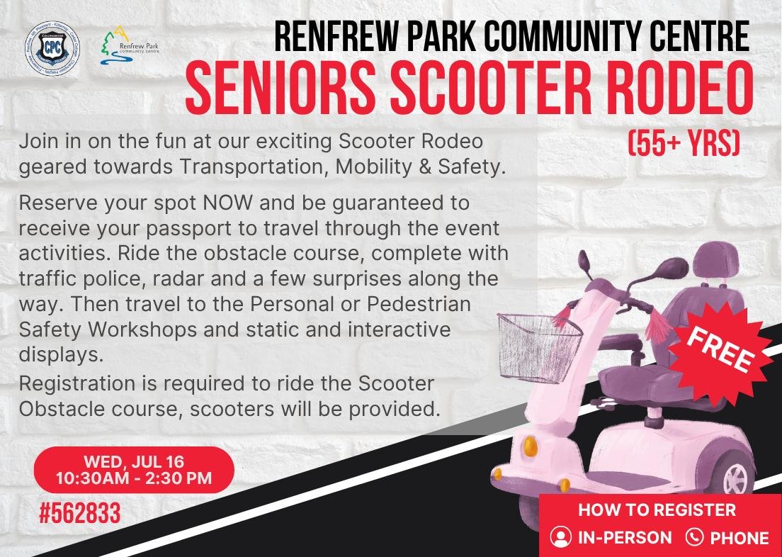 Join us for the Seniors Scooter Rodeo on Wednesday, July 16 from 10:30 AM to 2:30 PM, a fun and free event all about safety, mobility, and a little adventure!